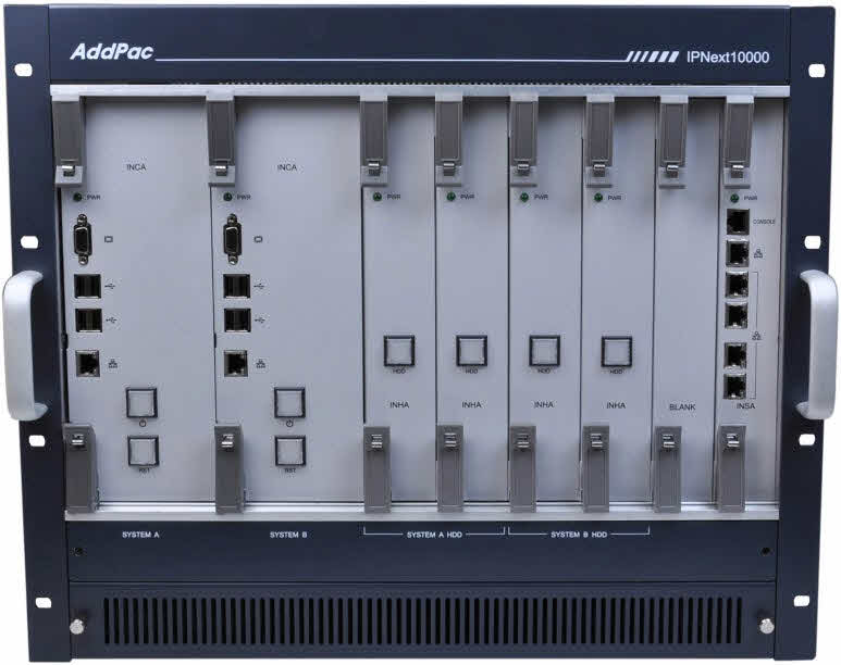 The IPNext2000 SIP call manager system also provides the Active-Standby system duplication features for fault tolerant architecture. For the system duplication, IPNext2000 supports dual hot-Swap CPU boards at the front part of chassis with SATA SSD RAID1 configuration per a CPU board. It also comes with two gigabit ethernet port and console port per CPU board. And IPNext2000 supports dual module type power supply.