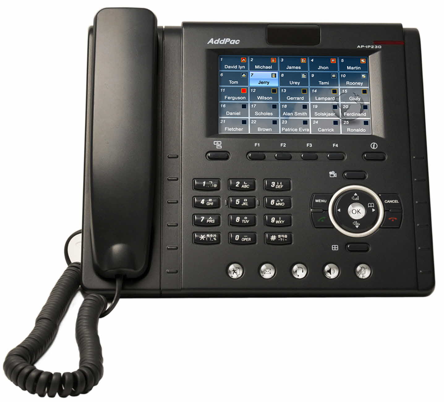 AP-IP230G Gigabit Ethernet IP telephone combines AddPac's field proven VoIP technology and IP voice broadcasting technology. AP-IP230 is market-ready IP telephone which provides a full suit of remarkable functionality compared to other typical IP telephones. Apart from telephony service, it delivers IP voice broadcasting service supporting external MIC/Line-in, Line-out interface for various input/output devices such as headset, Amp or speaker. In addition, it provides high level information display with 5 inch large size color LCD mounted. Since AP-IP230G supports diverse VoIP codecs according to bandwidth environment, it can be deployed anywhere on the internet, ensuring optimal voice quality by leveraging the latest QoS technology. Furthermore, installed along with, IPNext180, IPNext190, and IPNext600 on comprehensive IP-PBX system of AddPac Technology, it not only improves operation offering an wide variety of features such as Music on Hold, Coloring service, Call Transfer but also provides the easy-to-use, intelligent IP telephony service enhanced by MS window based Smart Messenger.