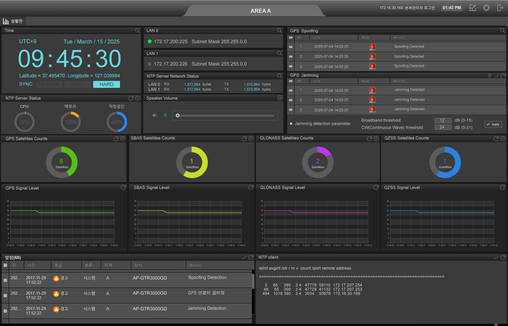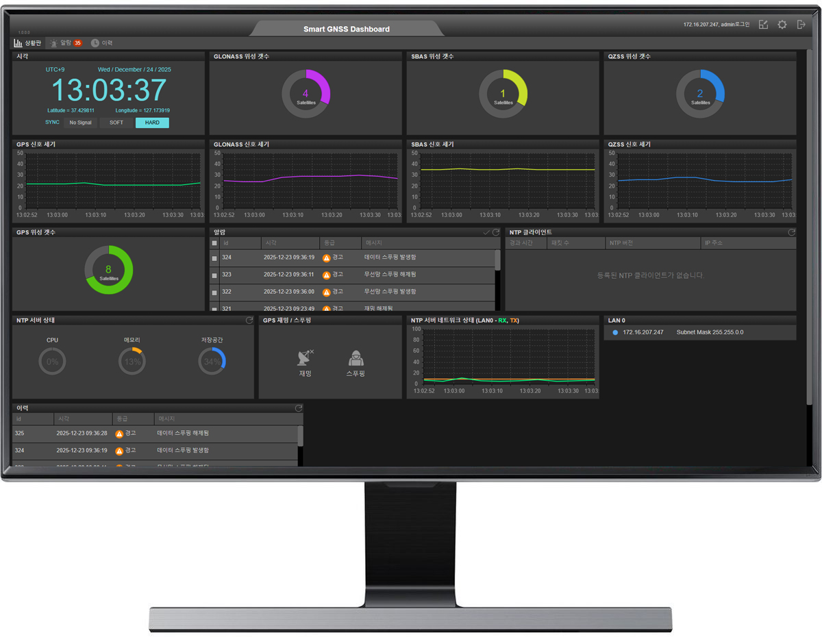 ¾ÖµåÆÅ ±â°¡ºñÆ®ÀÌ´õ³Ý GPS NTP (Network Time Protocol) ½Ã°¢µ¿±â ¼¹öÀÇ ½º¸¶Æ® GNSS (Global Navigation Satellite System) ´ë½Ãº¸µå ¼ÒÇÁÆ®¿þ¾î´Â À©µµ¿ì OS ȯ°æ¿¡¼ ±×·¡ÇÈÇÏ°Ô Á÷°üÀûÀ¸·Î GPS ½Ã°¢µ¿±â¼¹öÀÇ ½Ã°¢Á¤º¸, À§¼ºÁ¤º¸, ½ÅÈ£Á¤º¸, ¾Ë¶÷Á¤º¸ µéÀ» ½Ç½Ã°£À¸·Î Ç¥½ÃÇØ ÁÖ´Â ¼ÒÇÁÆ®¿þ¾î ÀÔ´Ï´Ù. GNSS ´ë½Ãº¸µå ¼ÒÇÁÆ®¿þ¾îÀÇ »ç¿ëÀÚ À¯ÀúÀÎÅÍÆäÀ̽º´Â ´ë½¬º¸µå ±¸¼ºÀ» »ç¿ëÀÚ°¡ ¿øÇϴ ȸ鱸¼ºÀ» À̵¿¹èÄ¡ ÇÒ ¼ö ÀÖ°Ô ¼³°è µÇ¾úÀ¸¸ç, »ç¿ëÀÚÀÇ Àå½Ã°£ ¸ð´ÏÅÍ ³ëÃâ½Ã ½Ã°¢Àû ÇǷεµ¸¦ ÁÙÀ̱â À§ÇØ ´ÙÅ©¾Øºí·¢ Ä®¶ó·Î µðÀÚÀÎ ÇÏ¿´½À´Ï´Ù.